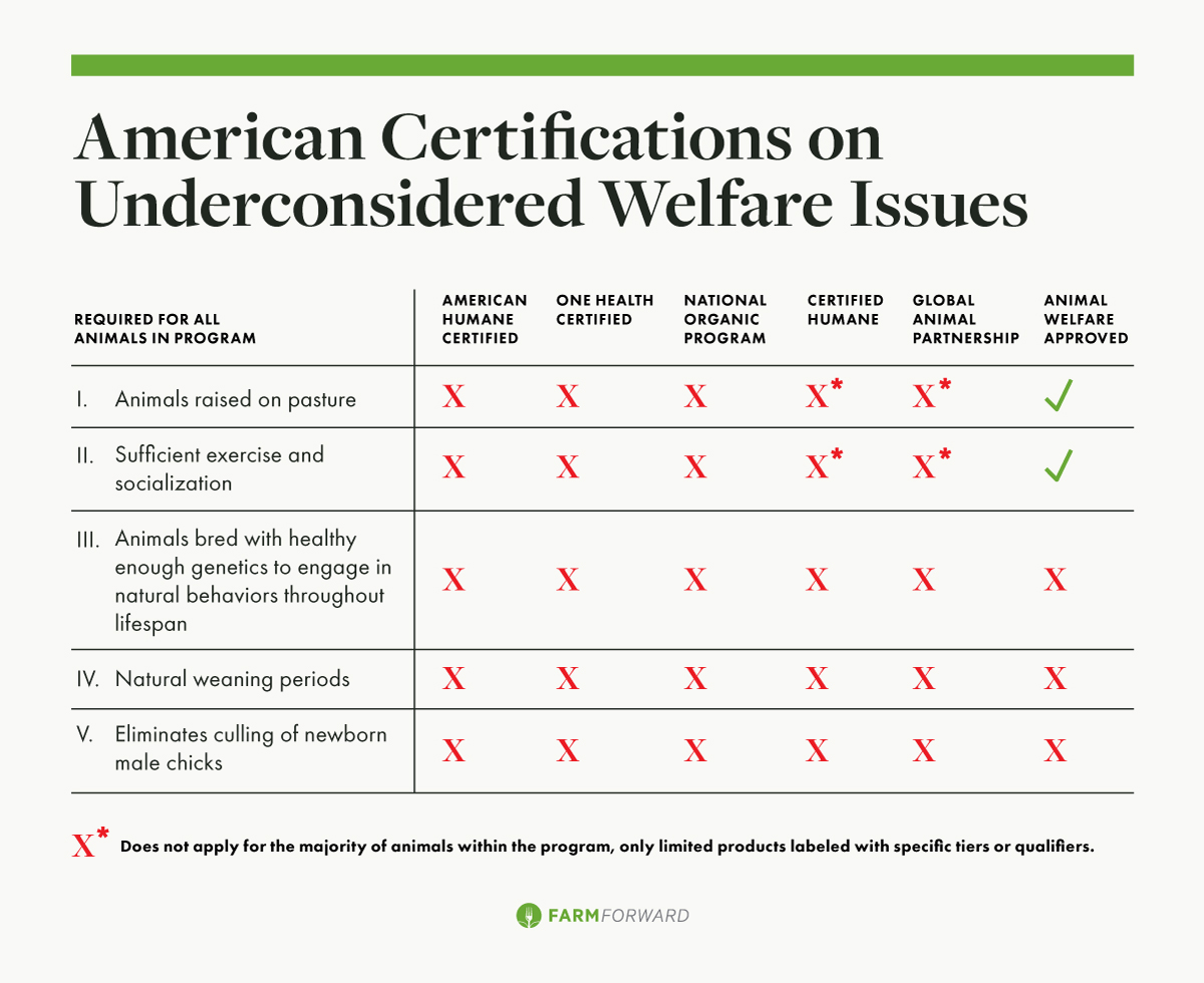 One independent certification, A Greener World’s (AGW’s) Animal Welfare Approved (AWA), stands out as anomalous: it is both the smallest and the most rigorous. It is the only certification that avoids the particularly disturbing humanewashing involved in certifying as humane products from animals raised in intensive confinement. However, AWA, too, struggles with the reality that other forms of cruelty, such as the forced separation of calves and mother cows before natural weaning or the use of genetic lines of chickens prone to disease and chronic pain, are so pervasive in modern animal agriculture that even it cannot insist that these cruelties be banned and continue to operate. Further, AWA’s high standards and commitment to protect smaller independent farmers have precluded its ability to scale to the level of other certifications like GAP. Indeed, it is difficult to imagine the circumstances under which the meat, poultry, dairy, and egg companies that dominate the industry today would adopt AWA standards at scale with options like AHC, Certified Humane, or GAP available. Thus, while AWA could partially be viewed as an exception to the humanewashing rule, its inability to achieve market scale is another datum illustrating the failure of animal welfare certification.
