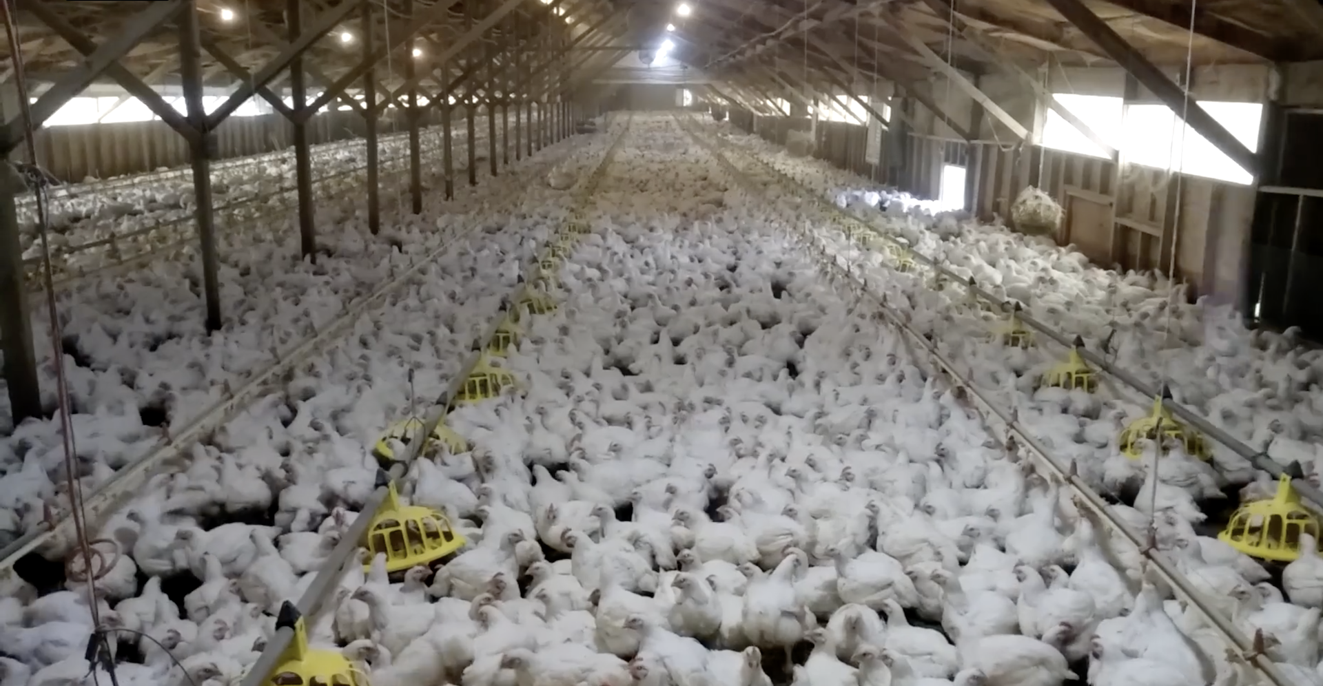 This term applies to virtually all chickens used for meat, who are raised indoors on factory farms, as cages are not used by the broiler industry. For egg-laying hens, cages are replaced with crowded indoor aviaries. No outdoor access is required.