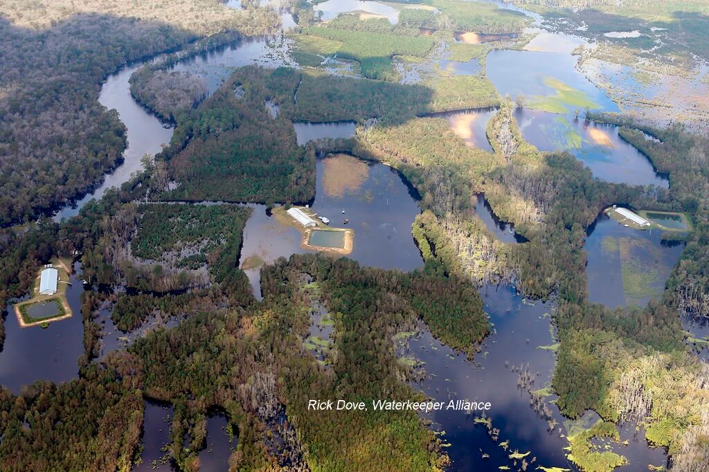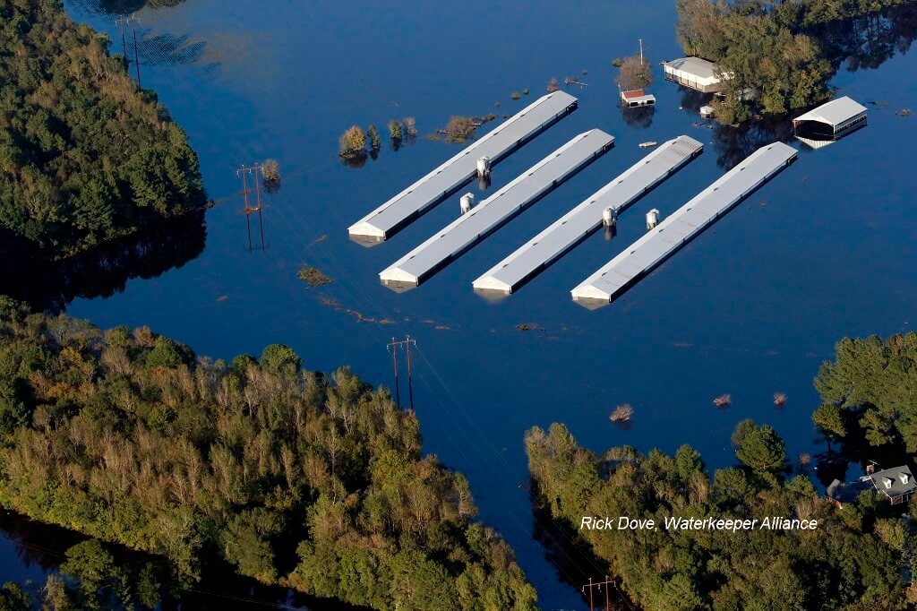We’ve seen a lot of these facilities where…the industry calls it “overtopping.” That kind of sounds like putting whipped cream on a dessert. “Submersion” is what’s happening. These lagoons go underwater, and when the floodwaters recede, they take the contents with them. We’ve got videos of hogs floating down the river. We’ve got dead chickens floating around in their own feces. Some journalists actually kayaked inside of some the poultry barns and filmed the dead chickens floating in the barns in the muck. It’s a terrible sight.